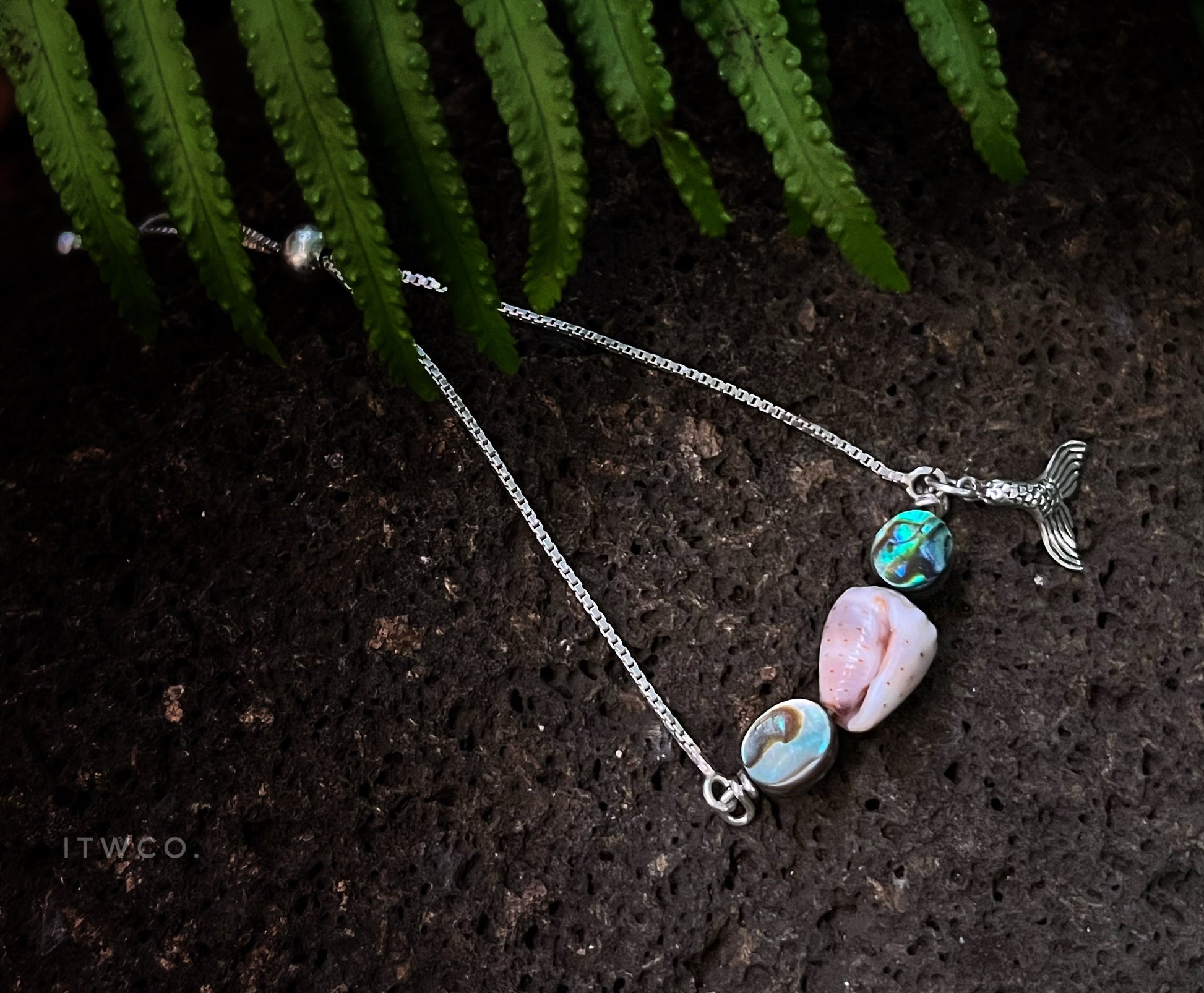 Abalone + hand picked Hawaiian cone shell woven onto sterling finished with a sterling silver mermaid tail or compass rose charm on an adjustable box chain